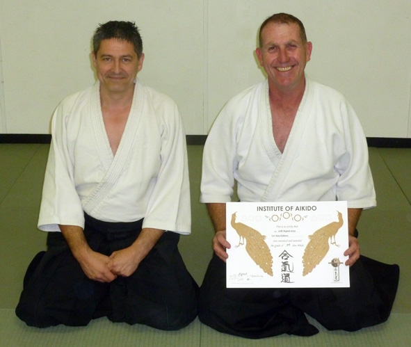 On Tuesday 24 September 2013 Sensei William Timms presented a 3rd Dan Certificate to club member Ken Kidston. Ken passed his grading at Summer School in August this year. In the picture Ken is of course the one with the big cheesy grin! Congratulations Ken from all your mates!